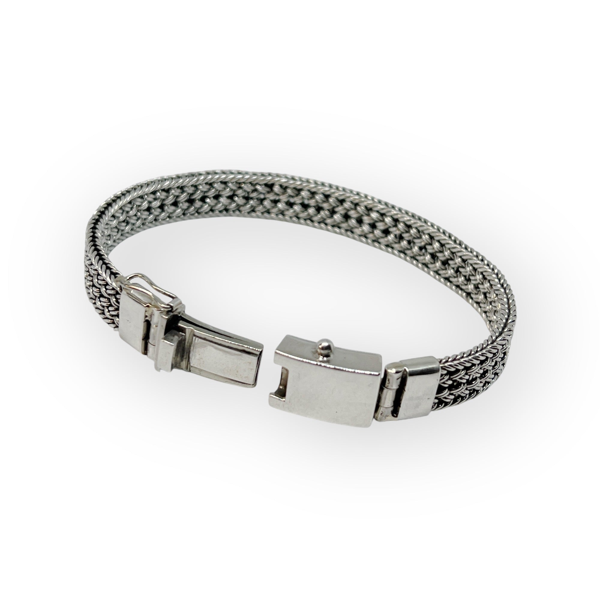 Description: This sophisticated piece features a tightly woven mesh braid construction, offering a unique blend of industrial texture and elegant shine. The intricate weaving creates a flexible yet durable structure that sits comfortably against the skin. At 41 grams, it is a substantial, high-density bracelet that feels significant on the wrist. It is finished with a wide, integrated fold-over clasp for a seamless look.