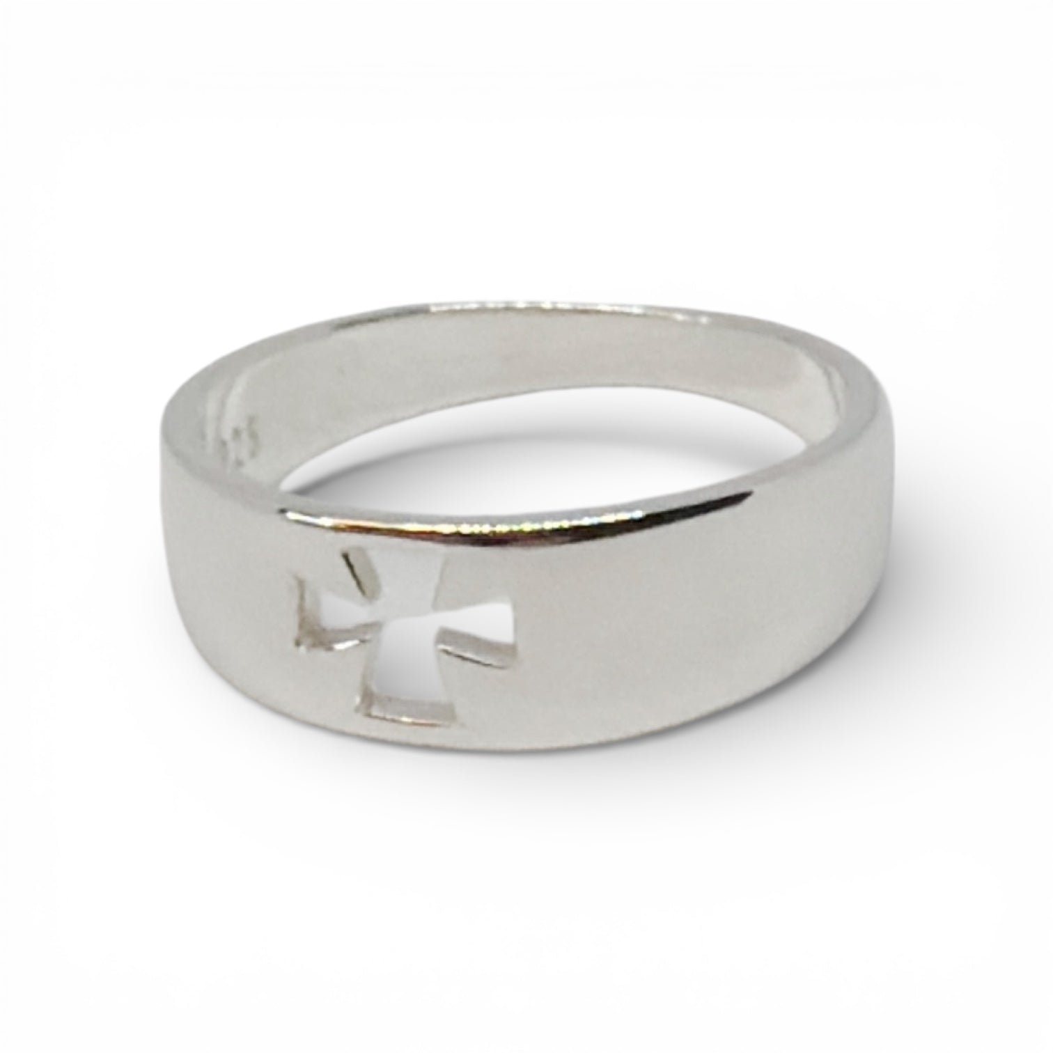 Make a statement with this precision-crafted Sterling Silver band. Featuring a distinctive cut-out cross design, this ring combines historical symbolism with a clean, contemporary silhouette. Because the design is cut directly through the metal, it offers a striking contrast against the skin.