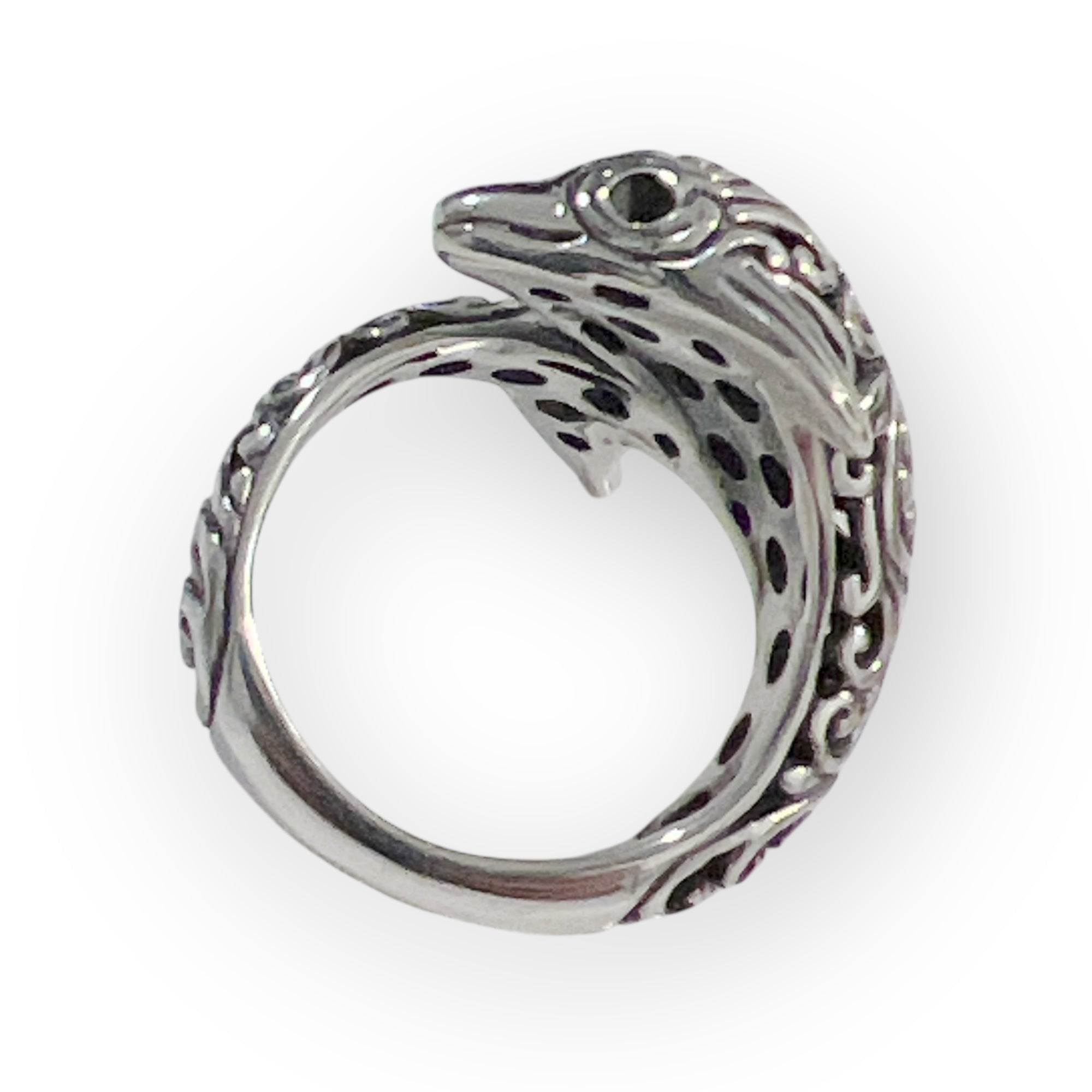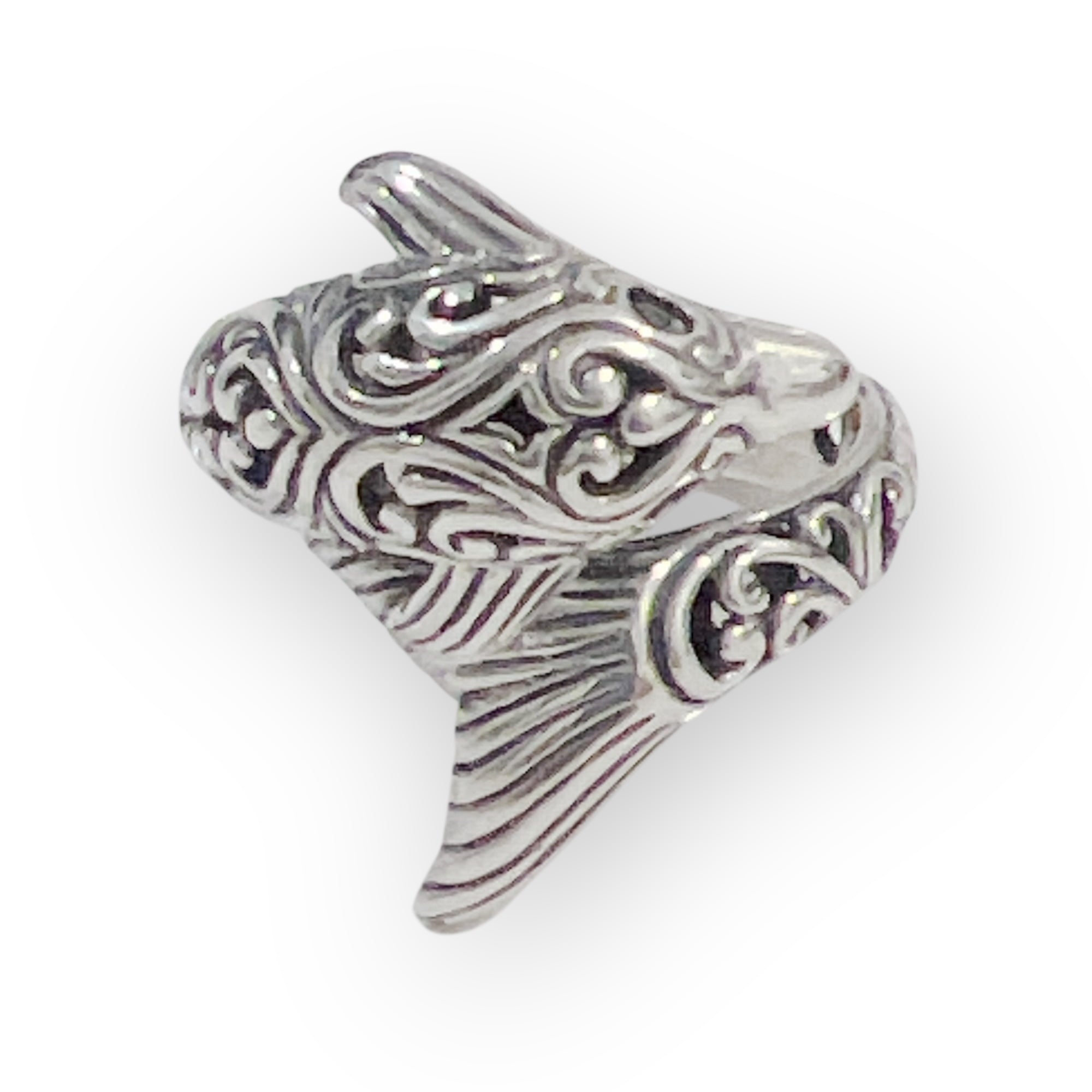 Expertly cast in premium 925 sterling silver, this handcrafted dolphin ring showcases exceptional attention to detail. The body of the dolphin is adorned with complex, open-work scrollwork, transitioning into a beautifully textured tail fin that secures the bypass design. The oxidized accents provide deep contrast, highlighting every hand-finished curve. Durable enough for daily wear and elegant enough for special occasions, it’s a testament to artisan silversmithing.