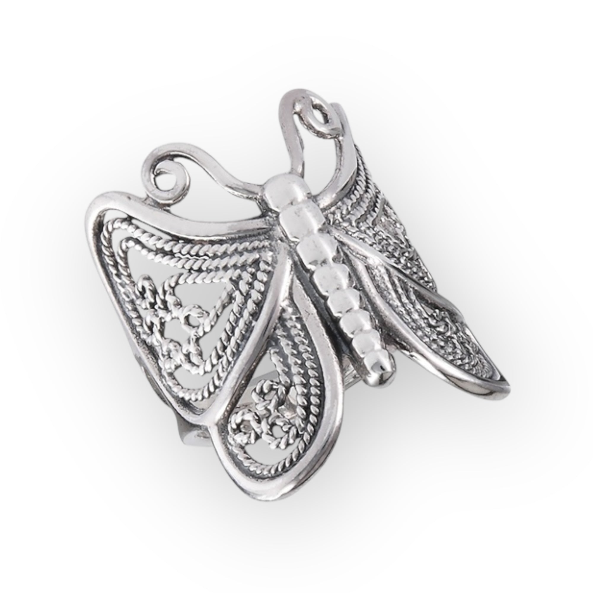 Elevate your style with our Grand Butterfly Sterling Silver Ring. Crafted from 925 sterling silver, this detailed ring contours to your finger for a comfortable fit. The butterfly design adds a touch of whimsy to any outfit. Face Height: 23 mm (0.91 inch) and Band Width: 3 mm (0.12 inch). Minimalist elegance at its best.