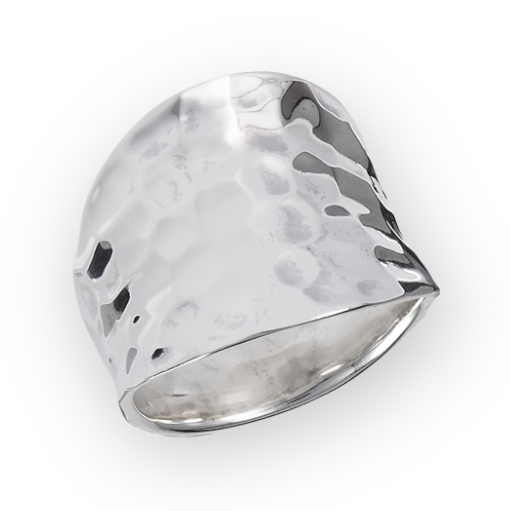 This Hammered Wide Band Silver Ring features a bold, minimalist design with a hammered texture. Made of solid 925 sterling silver, it has a face width of 16mm. Add a touch of elegant simplicity to your look with this unique ring.
