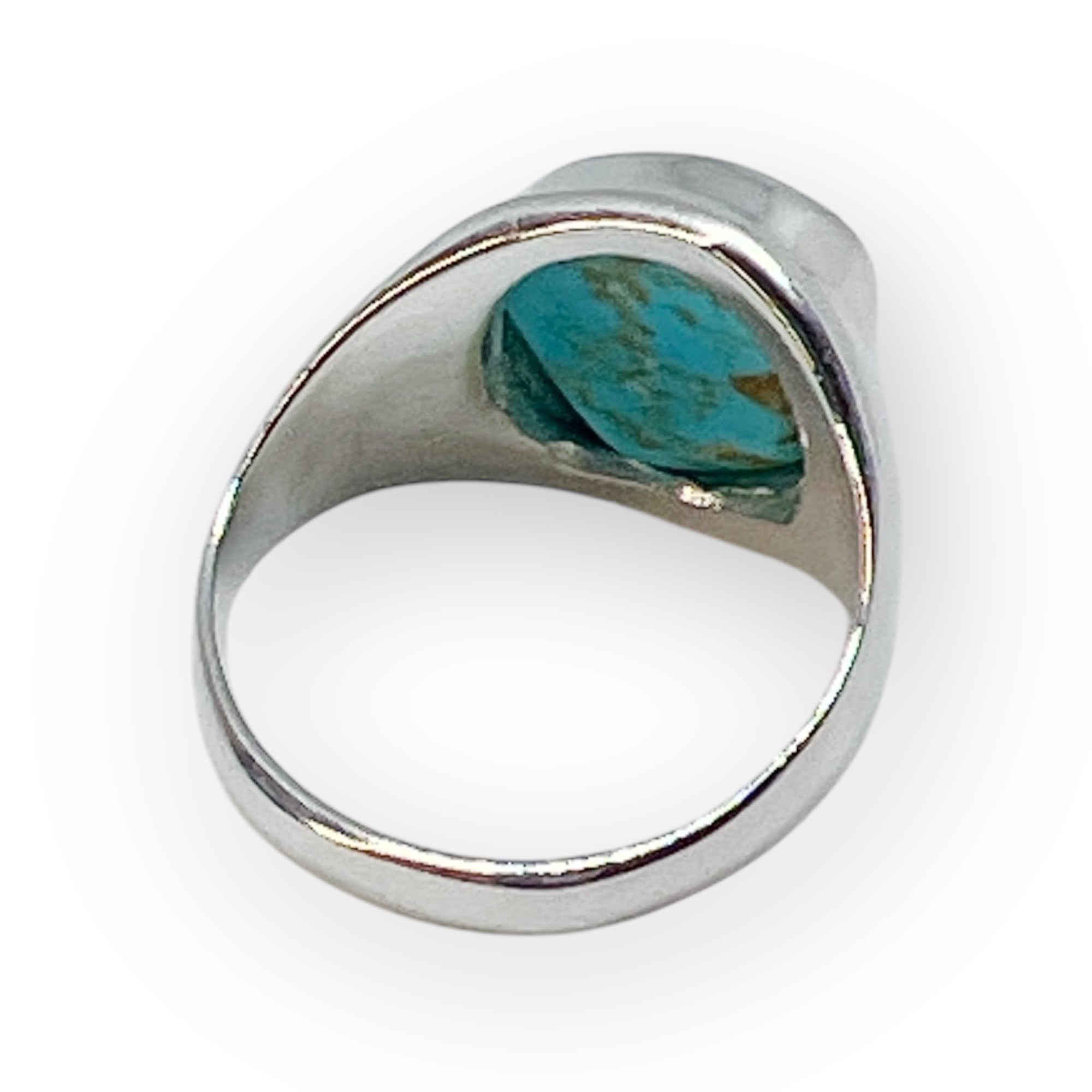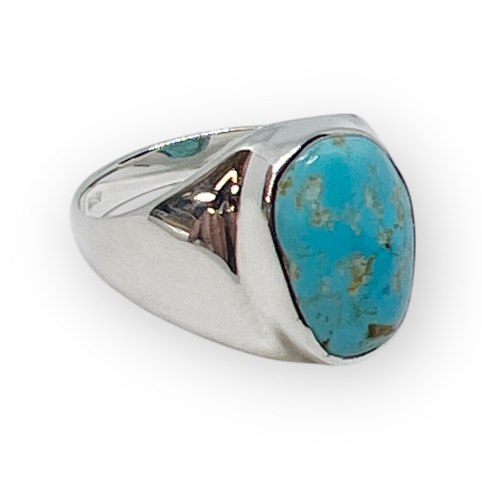 Expertly crafted with a rough natural Kingman Turquoise gemstone, this sterling silver ring will add a touch of elegance to any outfit. The medium band and bezel 16x13mm setting highlight the stunning gemstone, making it a perfect statement piece. Available in size 9.