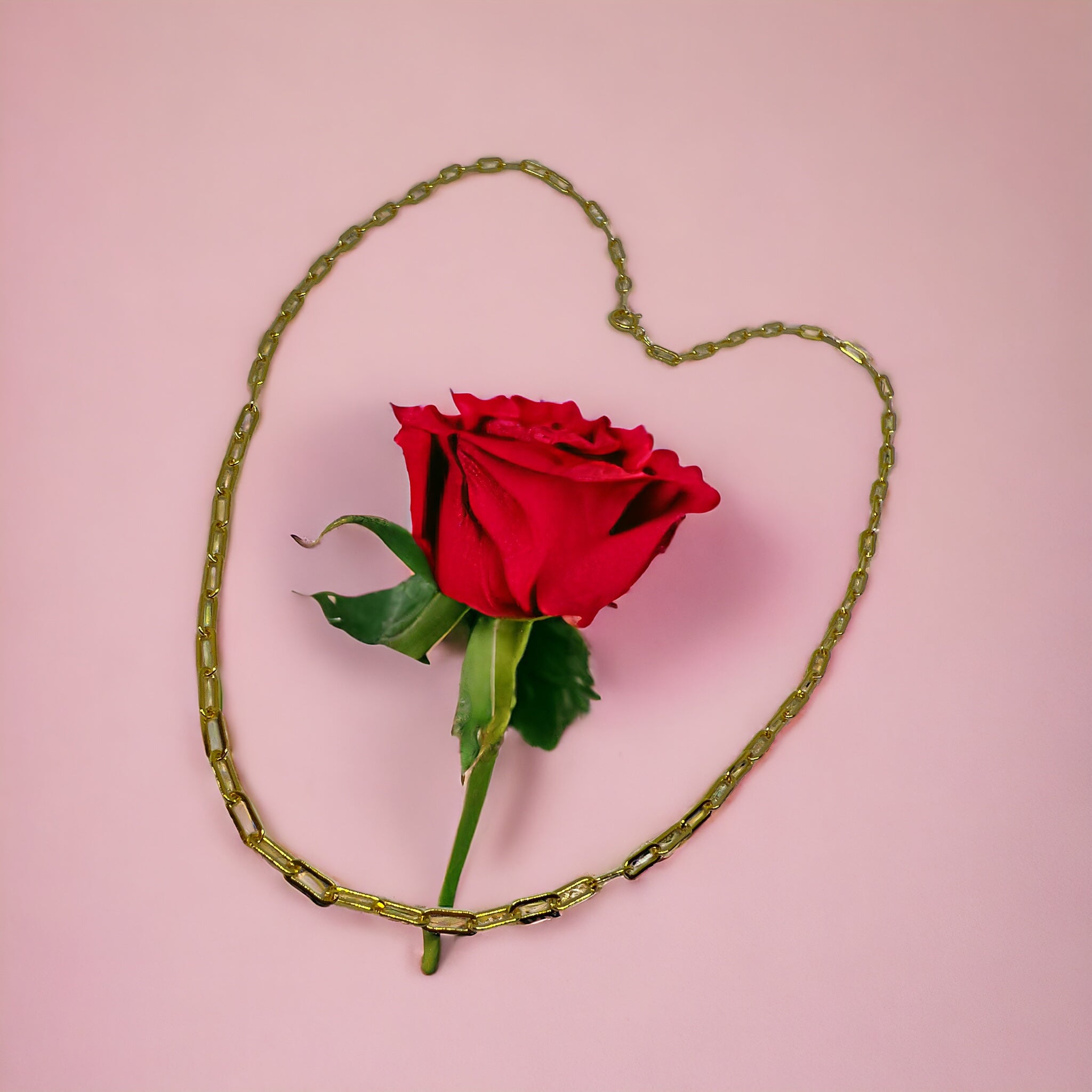 Sleek and modern, this 14kt *Gold Fill Paperclip Chain Necklace features a minimalist design with 2.5mm wide and 6.5mm long links. Adorn any outfit with this elegant necklace, crafted with high-quality materials for a timeless accessory.