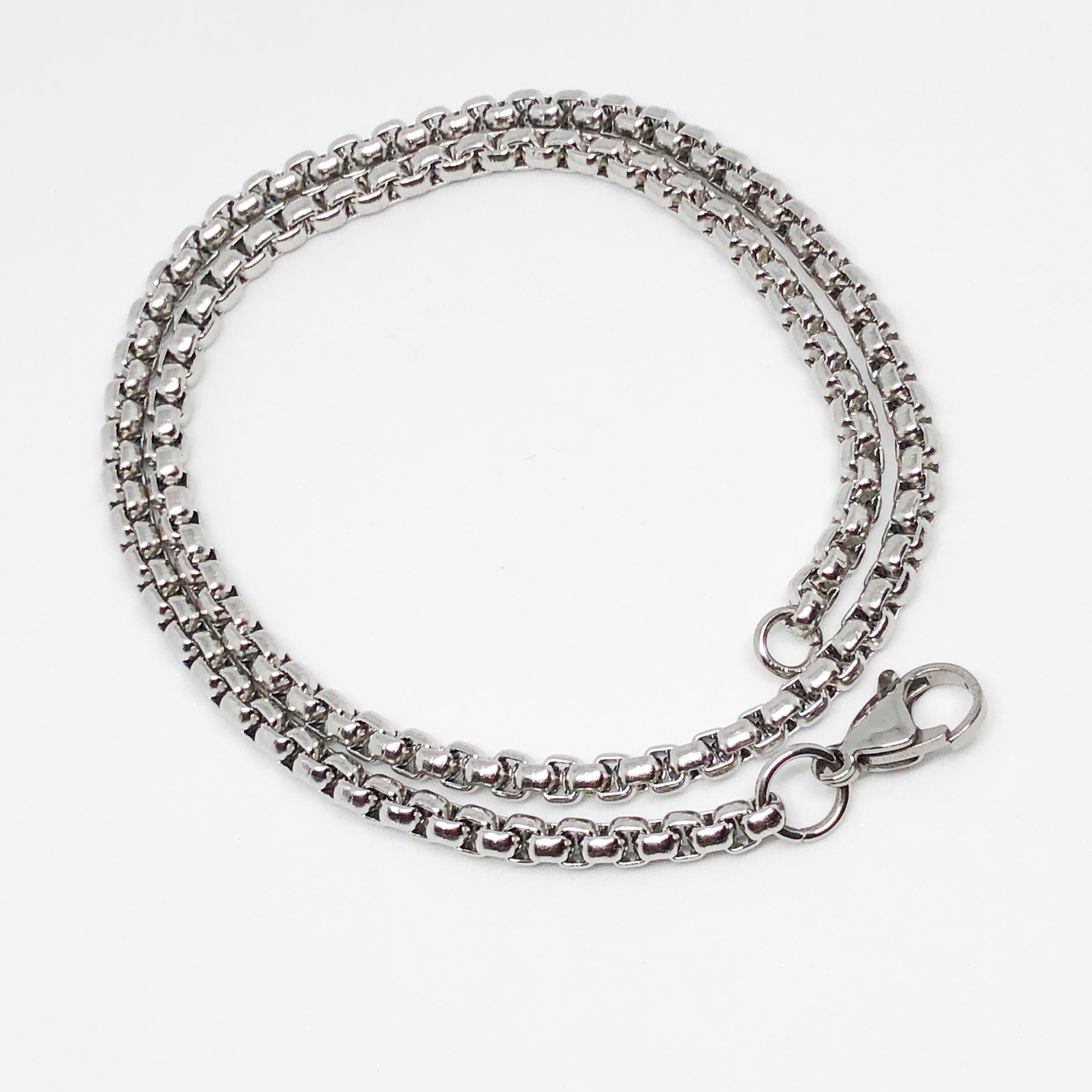 Your choice of length quality 4mm stainless steel Venetian Box link chain with lobster clasp.