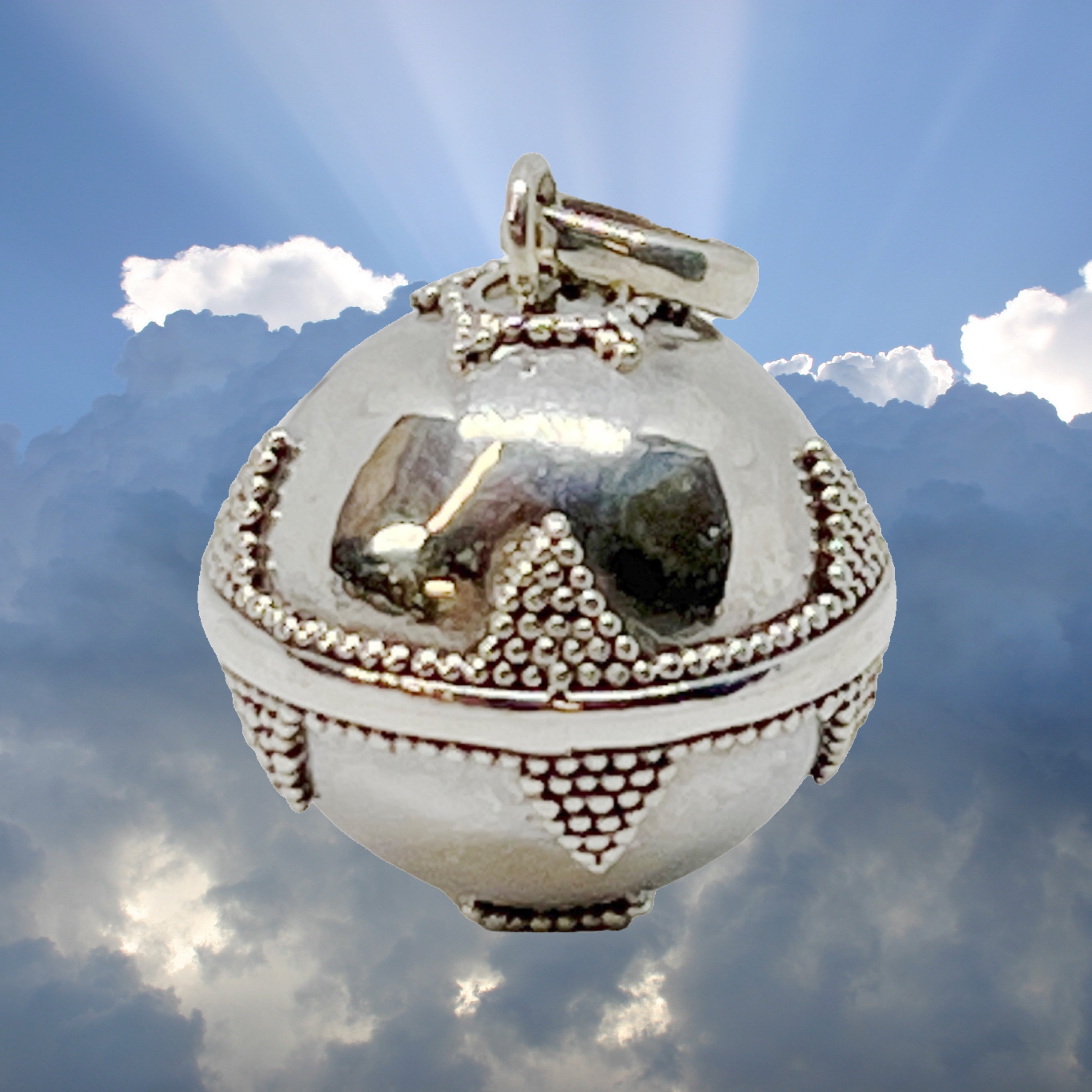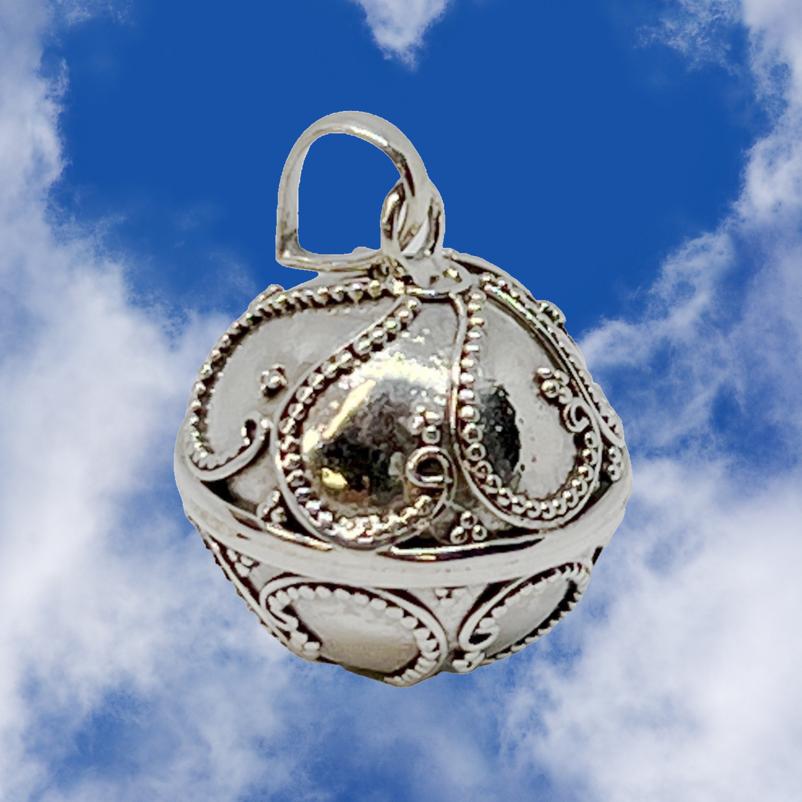Experience the soothing chime of the handmade 925 sterling silver Harmony Ball pendant necklace. Inside the beautiful sterling silver chime is a small brass ball that creates a gentle sound, bringing calmness to the wearer. Adjustable 16-19”stainless steel necklace chain included. Perfect as a gift of loving protection .