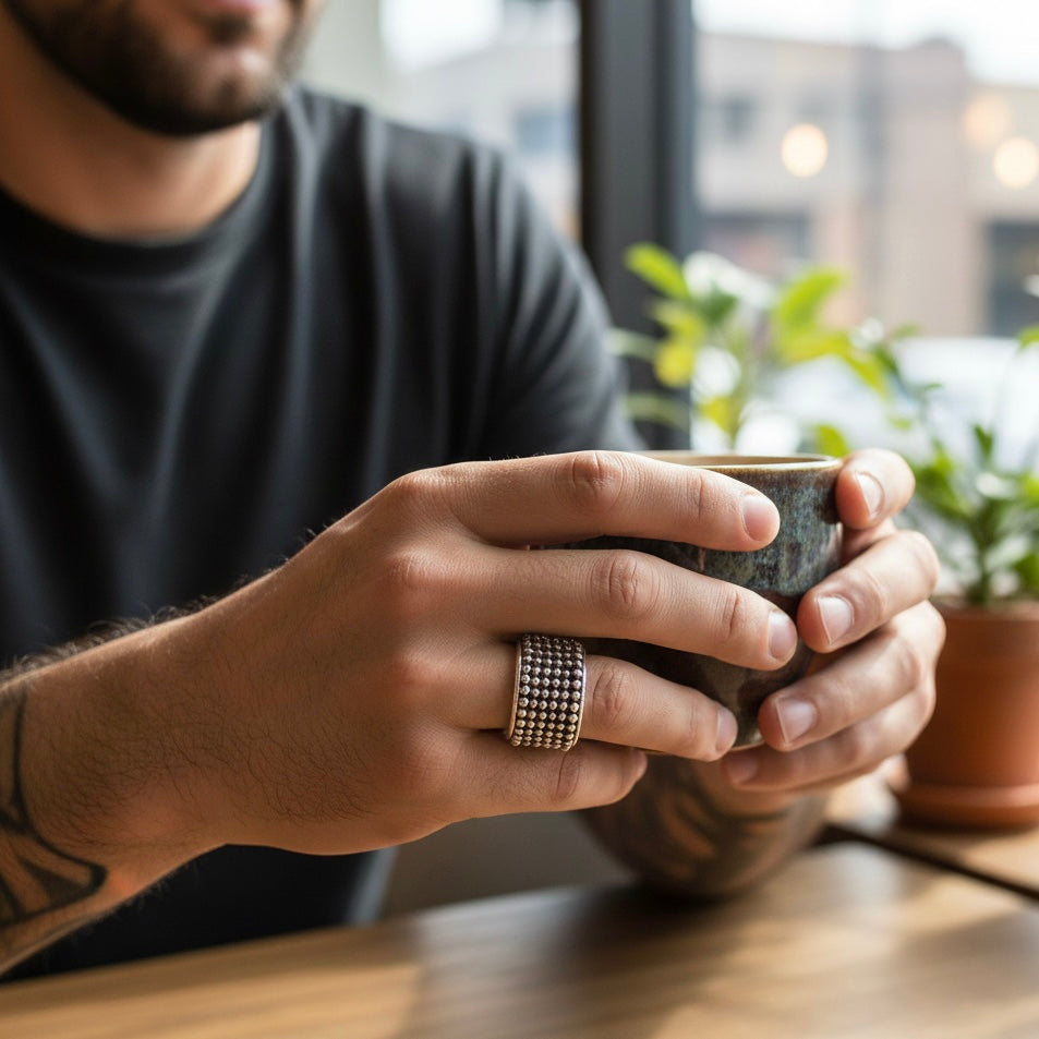 Expertly crafted from solid 925 Sterling Silver, this ring features a stunning 12mm wide profile that commands attention. The surface is meticulously adorned with traditional granulation—a centuries-old technique where tiny silver spheres are fused to the band to create a rich, organic texture that catches the light from every angle.