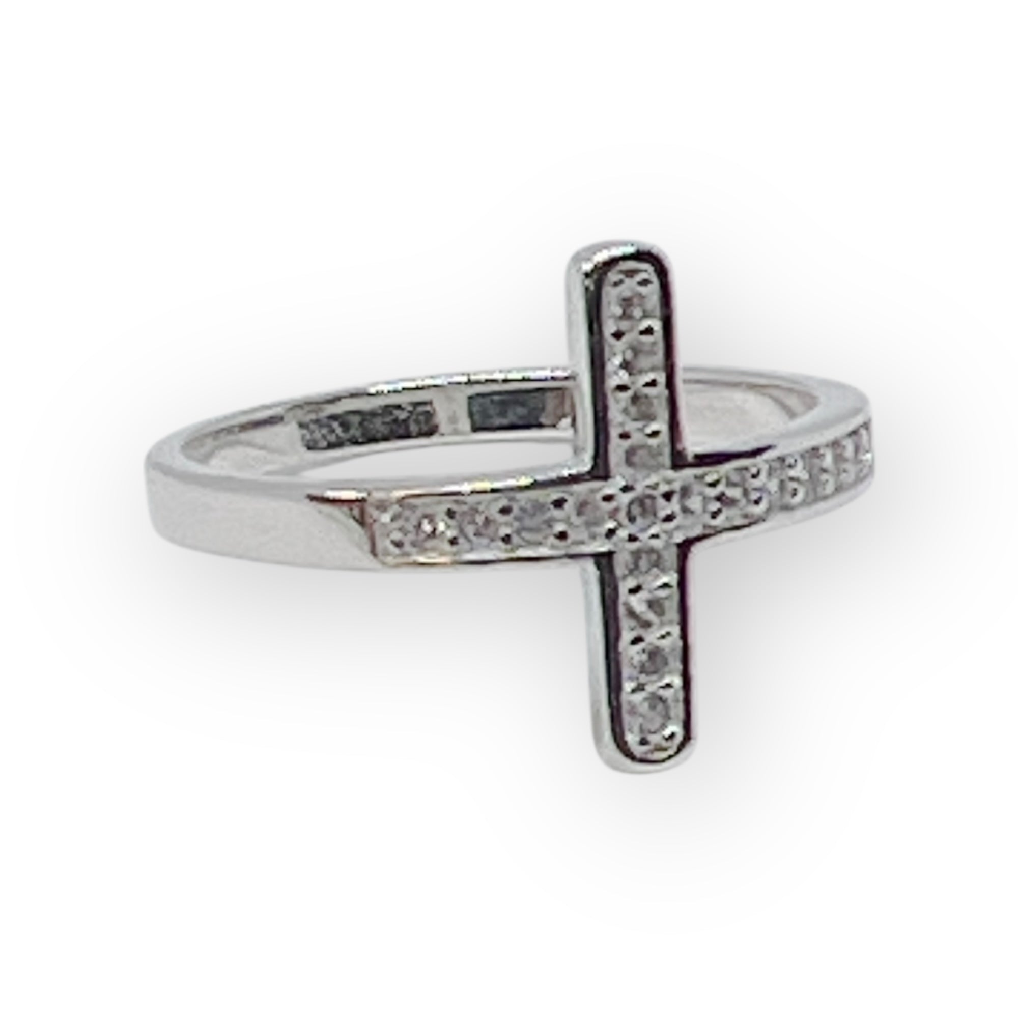 Modern Faith Sideways Cross Ring – .925 Sterling Silver & Pavé CZ