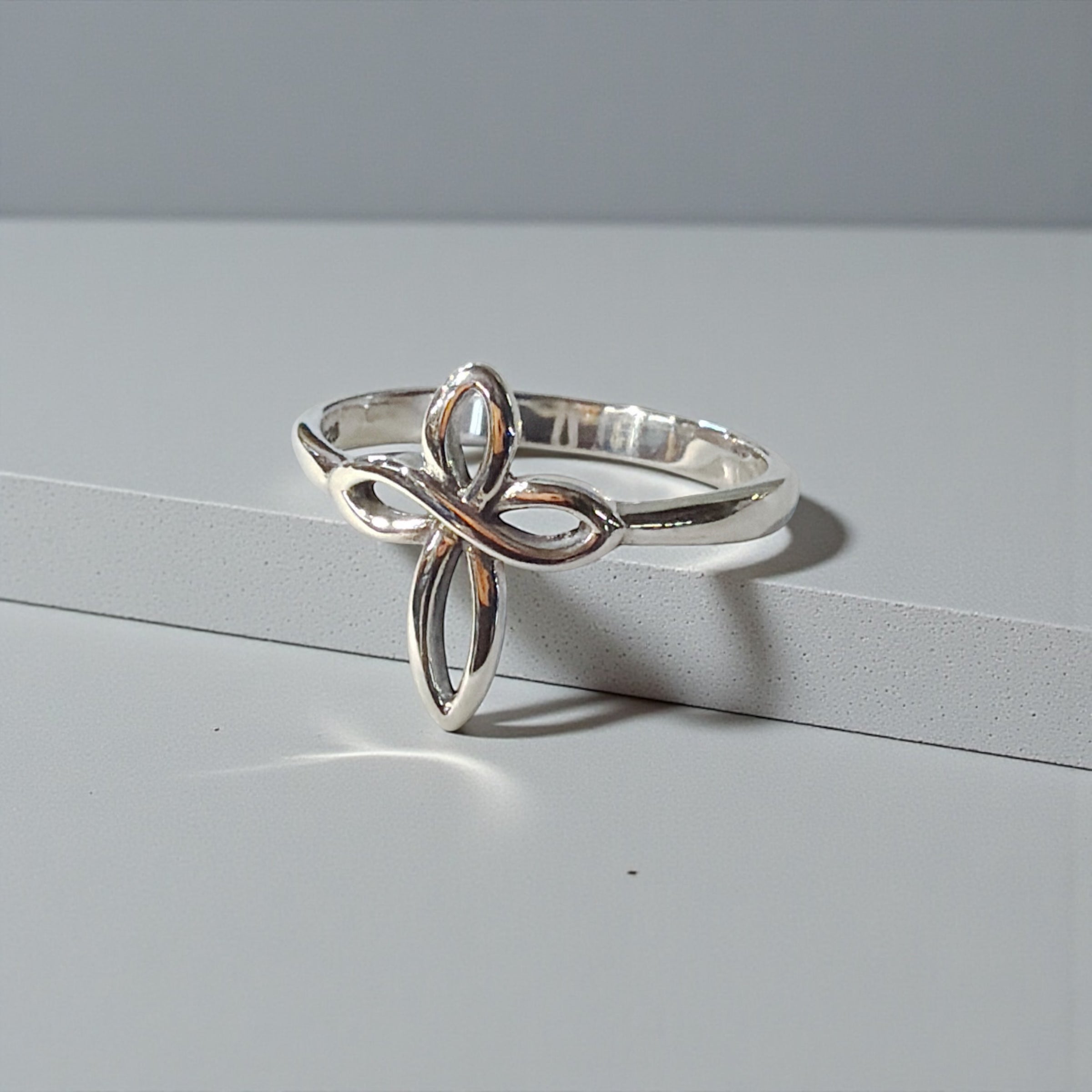 Art meets faith in the Serenity Ring. Featuring a unique, stylized infinity-inspired cross, this piece uses flowing lines and open-work loops to create a sense of lightness and grace. The centerpiece is integrated seamlessly into a smooth, high-polish band, making it a comfortable statement piece for daily wear.