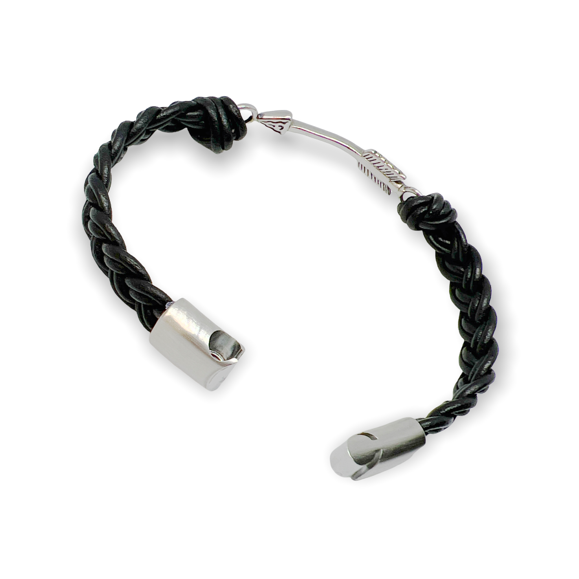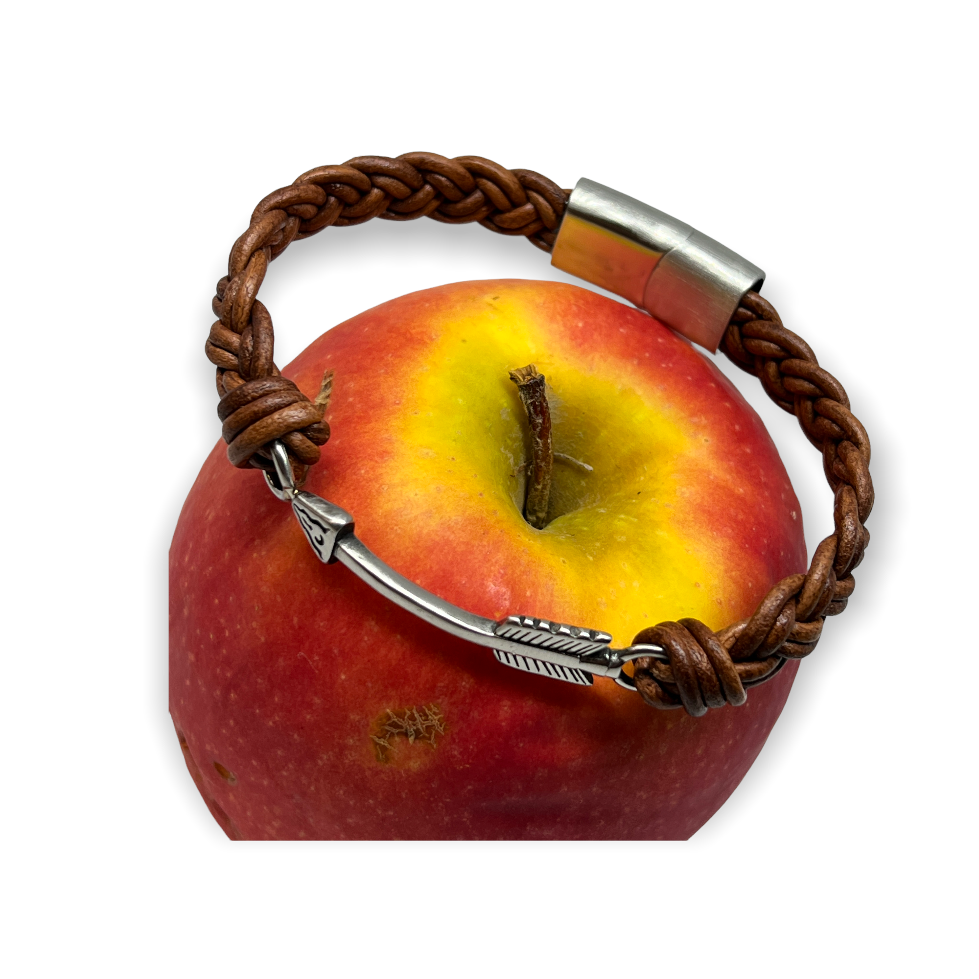 Hand braided natural dye leather brush stainless steel arrow bracelet. Hook is contoured to lay nicely across the your wrist. Includes stainless steel locking magnetic clasp.
