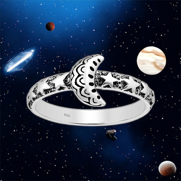 Embrace the celestial beauty with this Sterling Silver ring adorned with a delicate moon and star design. Made with 925 silver and a hallmark, this ring boasts a top width of 11⁄32 inches. A simple and natural way to add a touch of magic to your outfit.