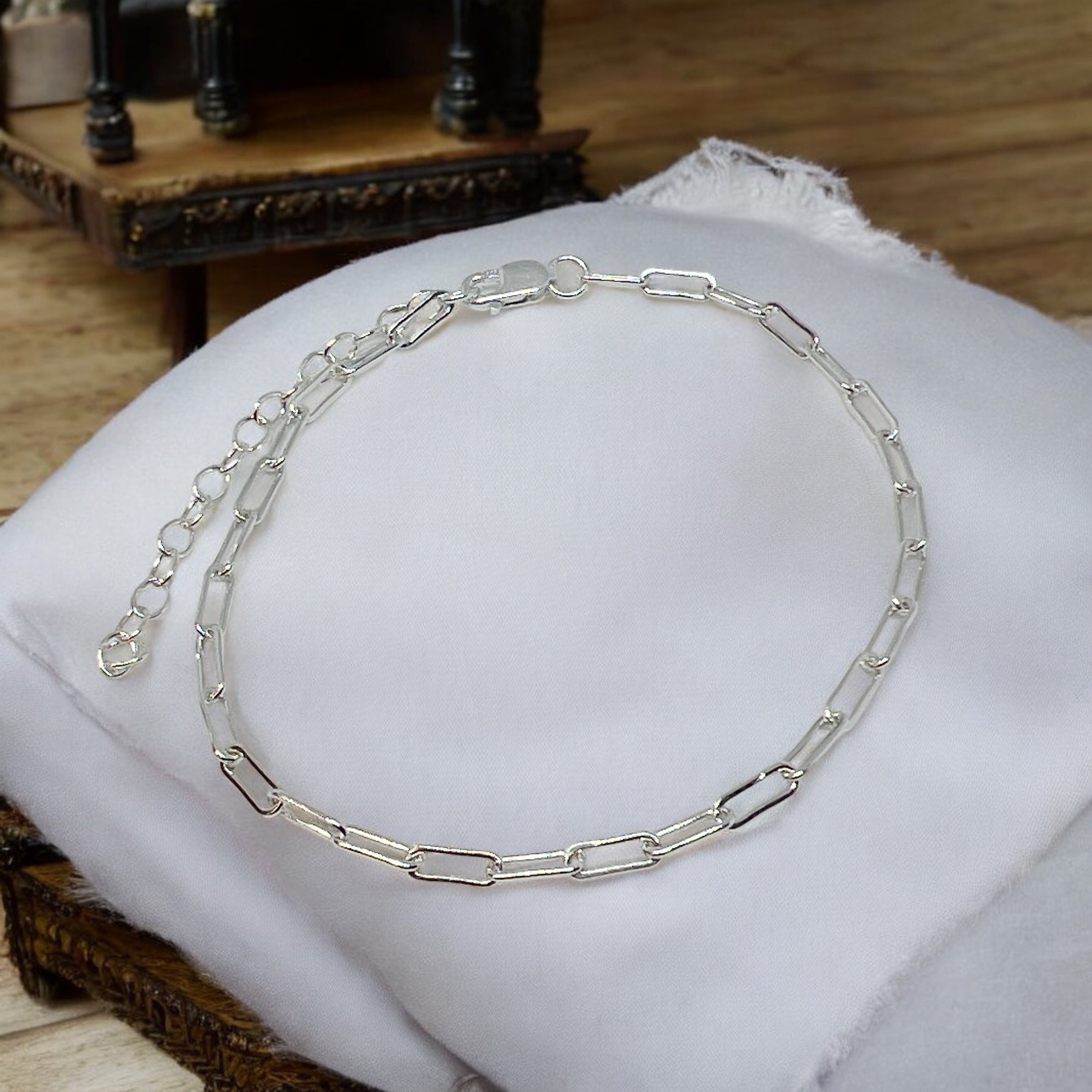 Elevate your style with our Sterling Silver Paperclip Chain Bracelet. Crafted from 925 sterling silver, this 6.5-8" adjustable bracelet boasts a delicate Paperclip Chain design and secure clasp. Embrace the romantic elegance of this high-quality piece.